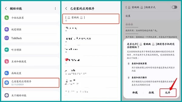 在首页点击“立即前往>>”,可直接进入设置页面,点击后选择“已安装” -> “[ ?? 雷跳跳 ??]”,授予无障碍服务权限(部分机型可能弹出警告提示,请放心授权)。